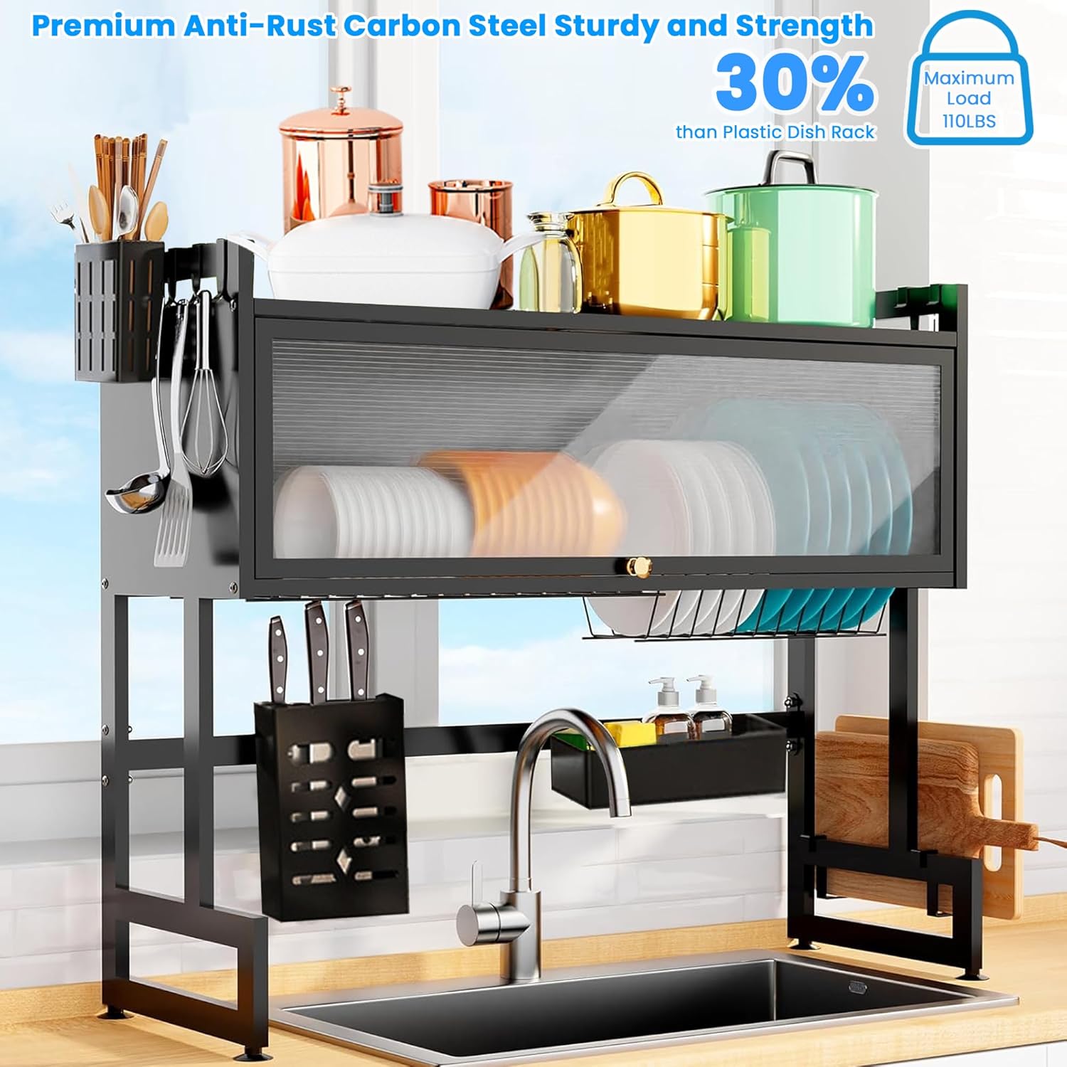 رف تجفيف الأطباق من الفولاذ المقاوم للصدأ بثلاثة طوابق مع غطاء - موفر للمساحة ومنظم