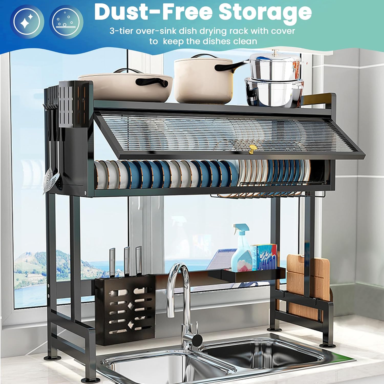 🏆 Premium 3-Tier Over-the-Sink Dish Drying Rack with Lid